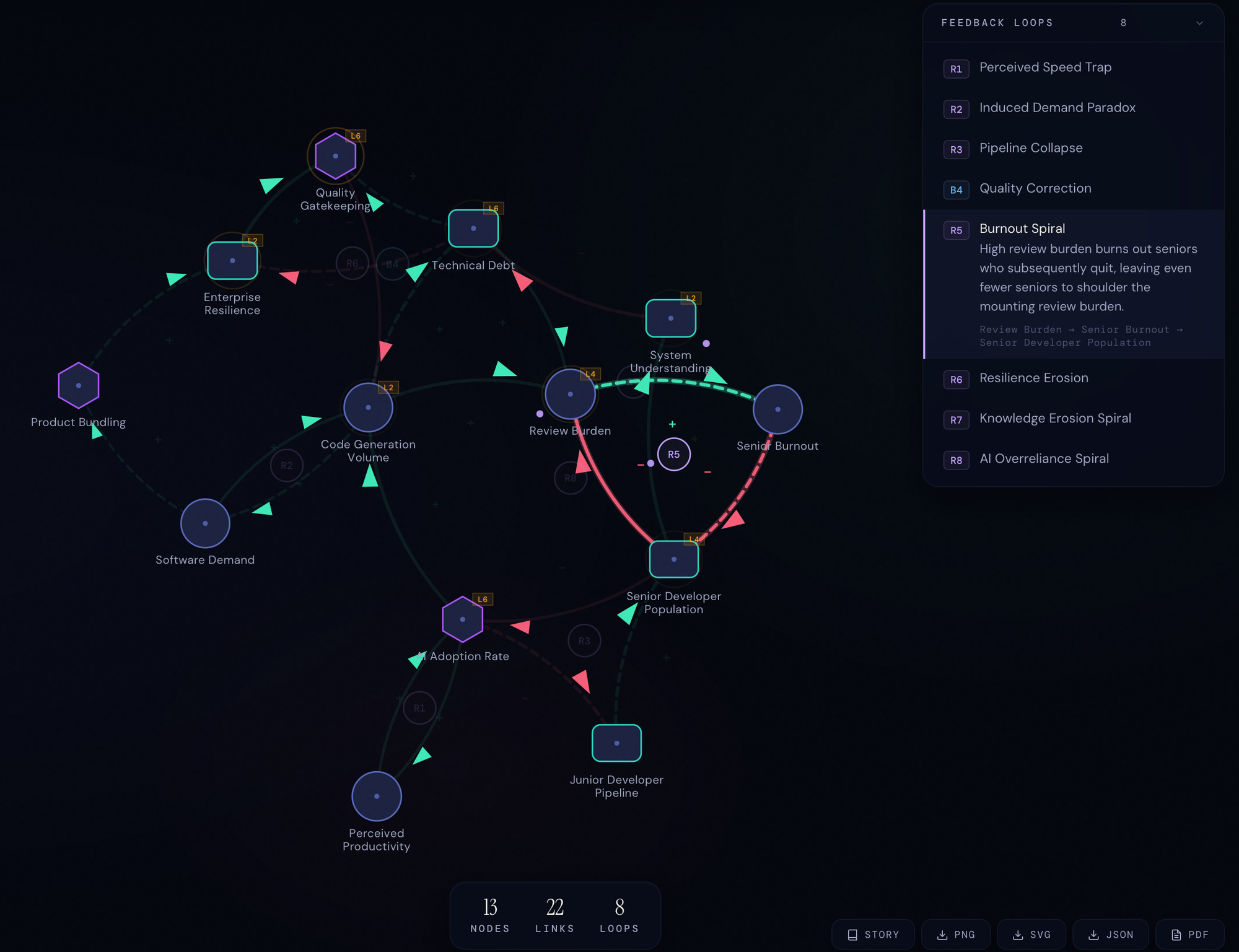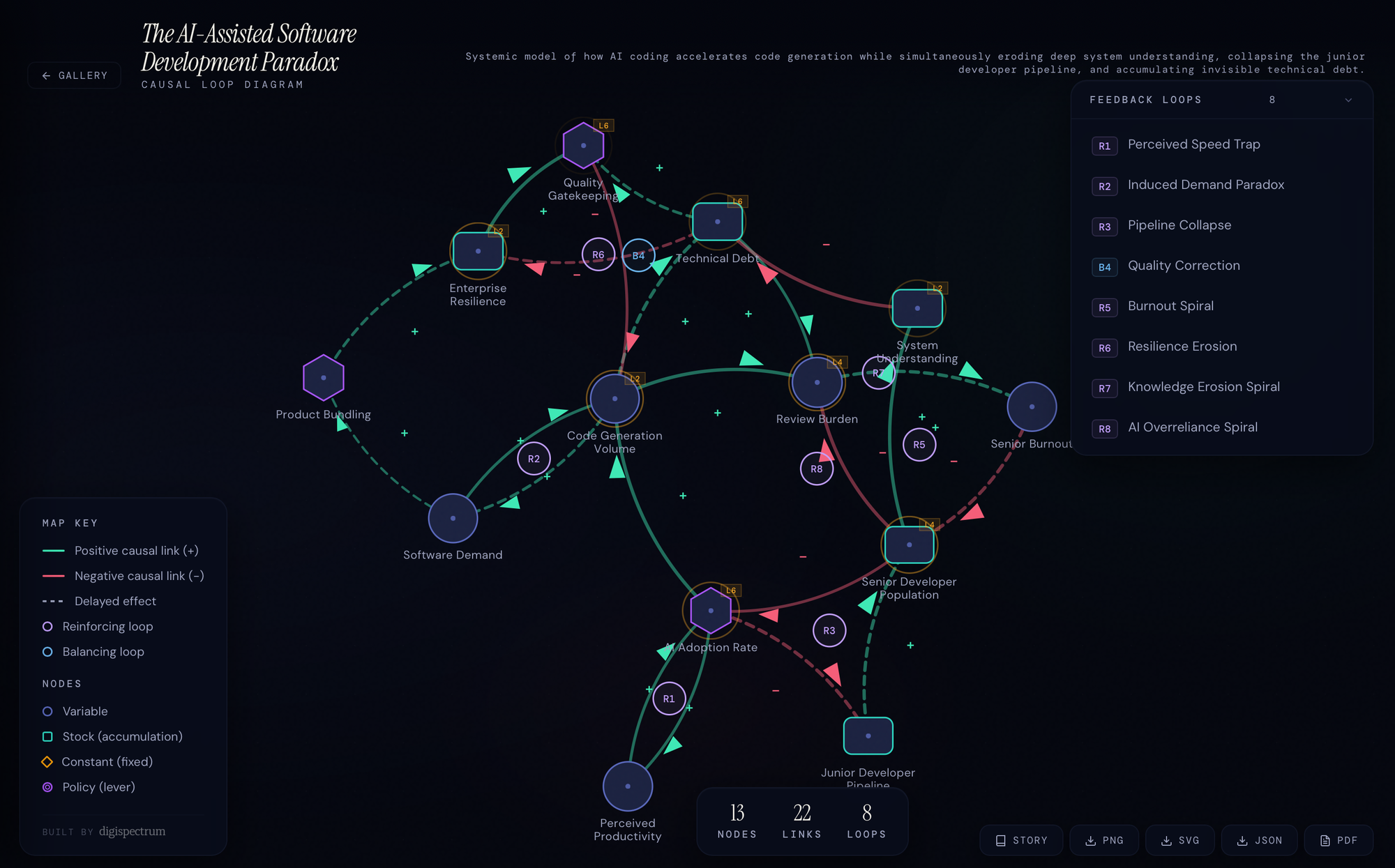 What began as a reflection on AI-assisted software development gradually became a broader inquiry into judgment, craft, apprenticeship, and the changing conditions of the software development process. To see those dynamics more clearly, I stepped back and modeled the system behind them through an interactive causal loop diagram.